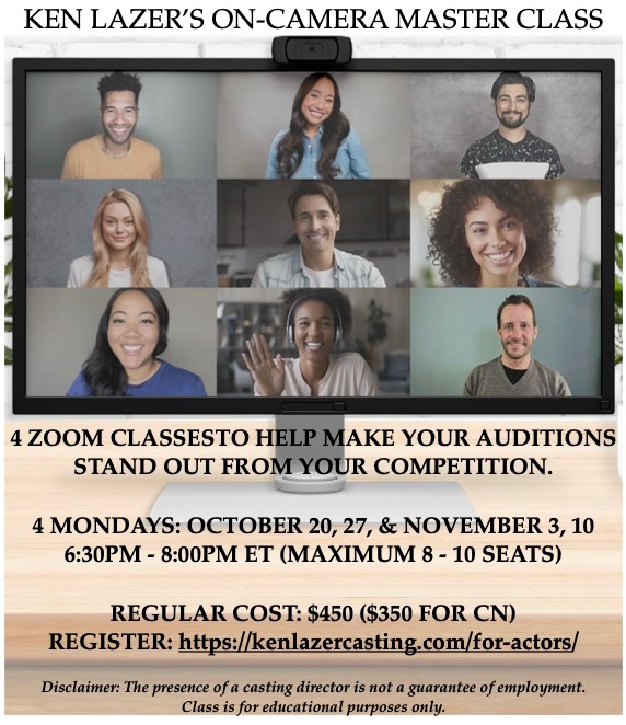 if you are investing in your acting career then this class is a must! More important than, “An Actor Prepares,” Ken Lazer walks you through techniques that will increase your booking ratio